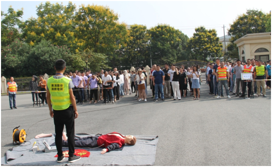 撤離到集合點(diǎn)后,分成各列隊(duì),在南消公司專業(yè)人員的指導(dǎo)下各人員一一進(jìn)行了心肺復(fù)蘇學(xué)習(xí)與實(shí)際操作。心肺復(fù)蘇有三個(gè)步驟:①確保受傷者盡可能平躺,用力按壓下巴;②將一只手的后掌放在胸骨上,將第二只手的手指在第一只手之間互鎖,進(jìn)行30次胸部按壓;③傾斜傷者的頭,抬起下巴,捏住鼻孔進(jìn)行1到2次口對(duì)口呼吸。