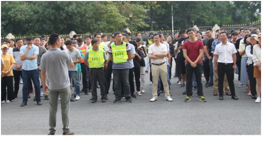 9月9日,參加演習(xí)的相關(guān)人員召開了演習(xí)前的安全會(huì)議,會(huì)議中介紹了消防疏散演習(xí)方案、流程、安全注意事項(xiàng)。確定了疏散集合點(diǎn)及消火栓滅火器演練點(diǎn)、明確了各個(gè)成員的職責(zé)以及對(duì)參加人員疏散演習(xí)時(shí)注意事項(xiàng)的說明。9月11日下午14:00,隨著警報(bào)聲的響起,領(lǐng)導(dǎo)小組發(fā)布演習(xí)開始的命令。各樓層工作人員在聽到火情警報(bào)后立刻停止手上工作,在疏散督導(dǎo)組人員的組織下從各樓層的安全通道撤離到疏散集合點(diǎn)。逃生的過程中,大家低著腰、沿著墻壁走,捂住鼻子、眼口,快速且有序,園區(qū)內(nèi)所有人員在5分鐘內(nèi)撤離集合完畢。