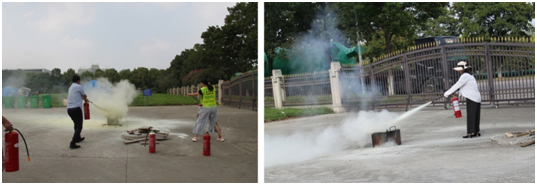 另外一邊的滅火器演習(xí)區(qū)氣氛也是非常的認(rèn)真熱烈。此次滅火器是采用的干粉滅火器,它適用于撲救各種易燃、可燃液體和易燃、可燃?xì)怏w火災(zāi),以及電器設(shè)備火災(zāi)。“紙上得來終覺淺”,在南消的專業(yè)指導(dǎo)后,大家也紛紛投入了滅火器的使用嘗試中。首先,用右手提著滅火器到現(xiàn)場(chǎng),除掉鉛封并拔掉保險(xiǎn)銷,左手握著噴管,右手提著壓把。在距離火焰兩米的地方,右手用力壓下壓把,左手拿著噴管左右擺動(dòng),噴射干粉覆蓋整個(gè)燃燒區(qū)。大家一個(gè)個(gè)排隊(duì)使用,雖然天氣炎熱,但始終對(duì)消防學(xué)習(xí)保持著高度的熱忱。